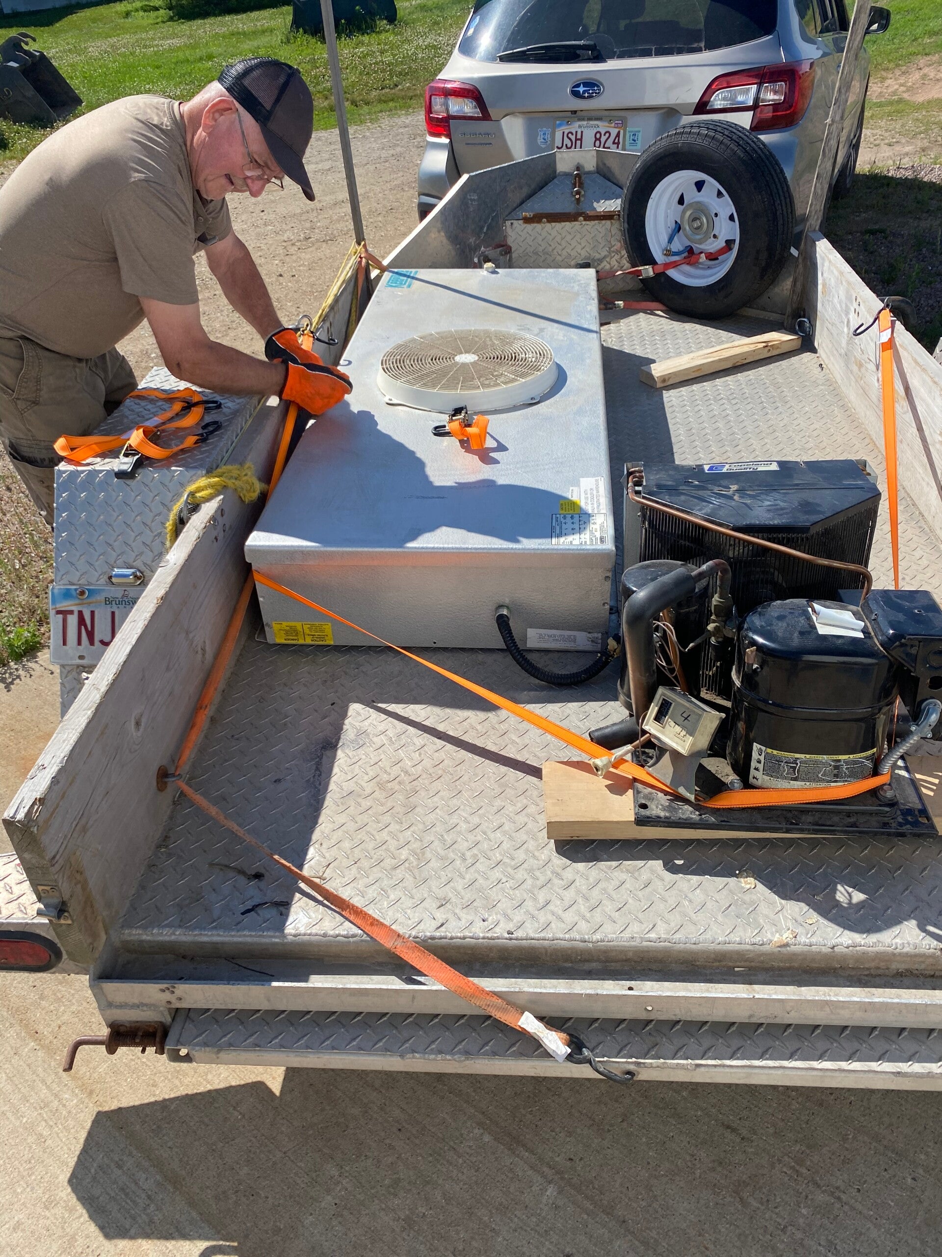 La Coop d'alimentation de Fredericton et la Coop IGA de Dieppe se joignent au projet de construction d'une chambre froide en faisant don d'une unité de réfrigération et de panneaux isolants. Un merci spéciale à Gérald Robichaud pour avoir facilité cette acquisition, et à Euclide Chiasson, Roger Landry et Jean-Louis Bourgeois pour avoir assuré le transport jusqu'au jardin.